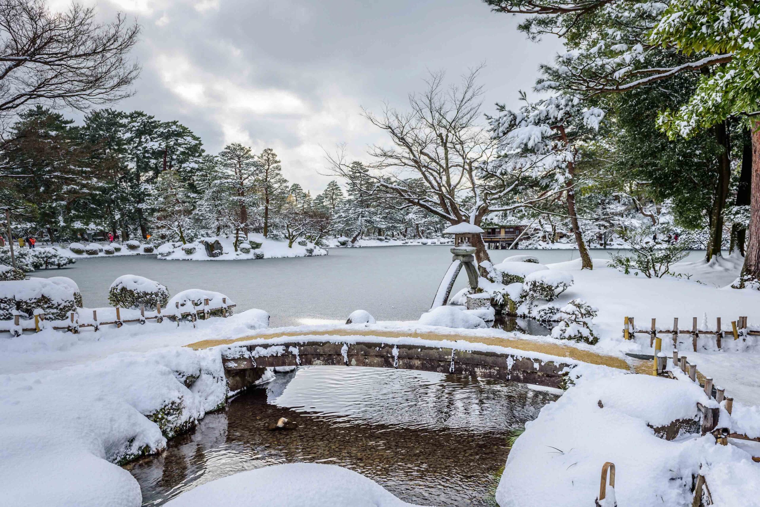 Một trong “Tam đại danh viên Nhật Bản”, Kenrokuen mùa đông khoác lên vẻ đẹp tĩnh lặng tuyệt đối. Tuyết phủ trắng những gốc thông yukitsuri – hệ thống dây chống tuyết đặc trưng, mỗi tối còn có chiếu sáng đặc biệt và đôi khi có hòa nhạc tại trà thất Uchihashi-tei.
