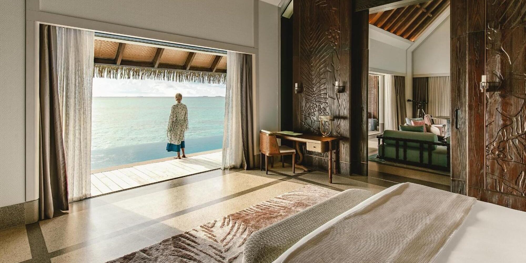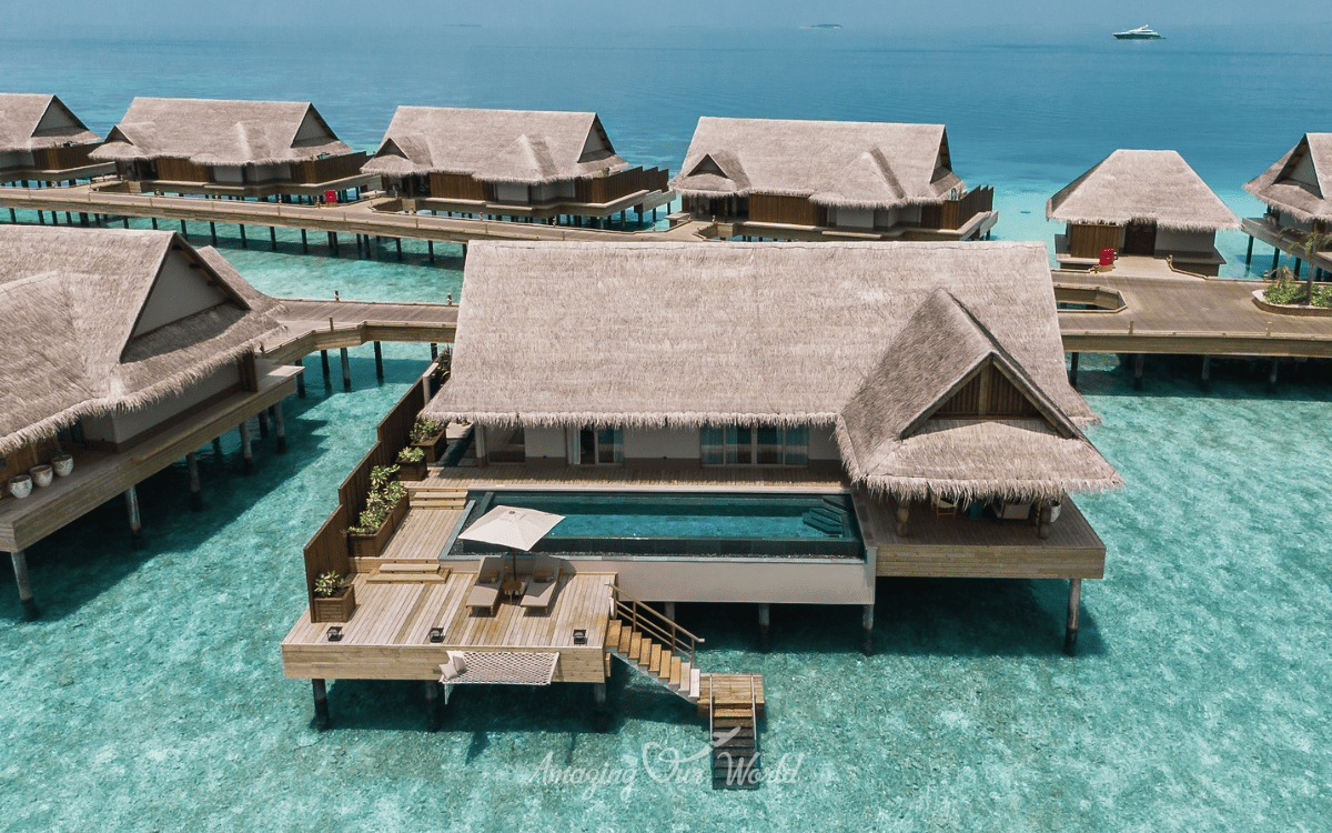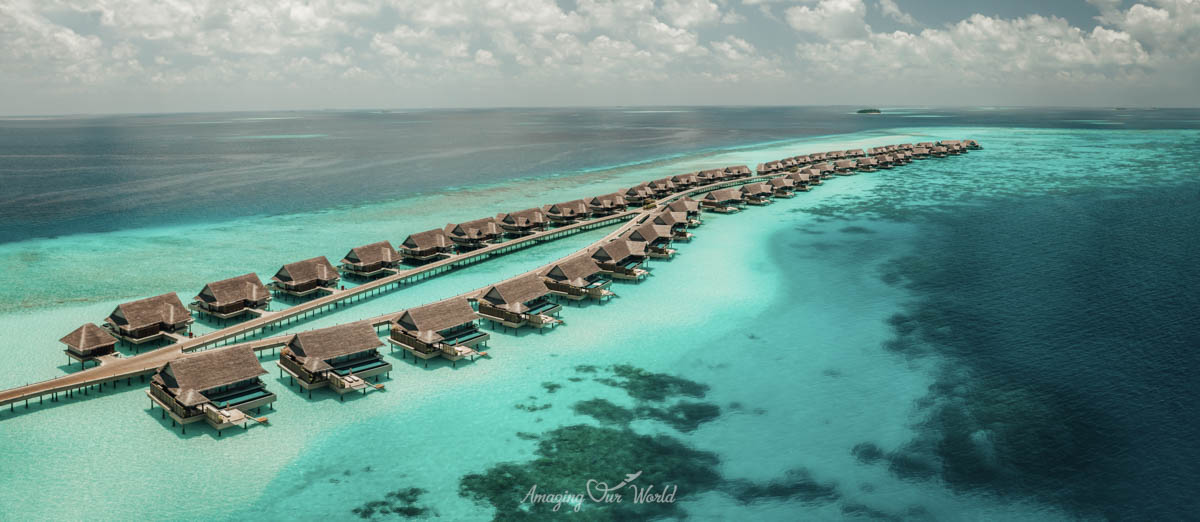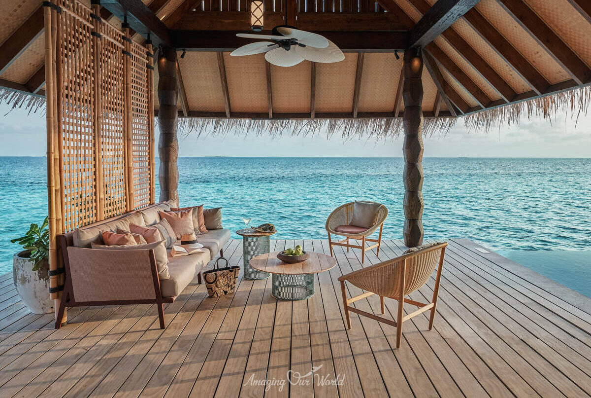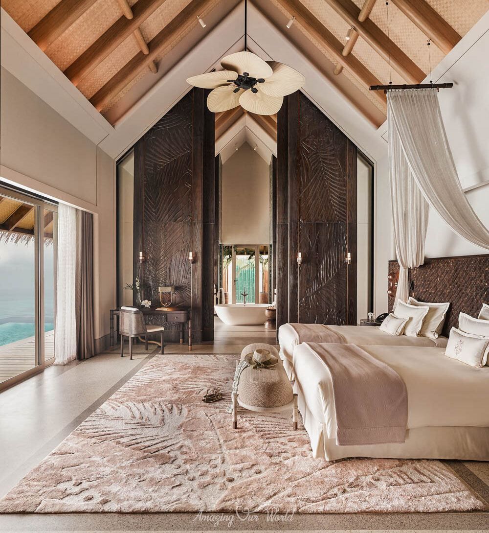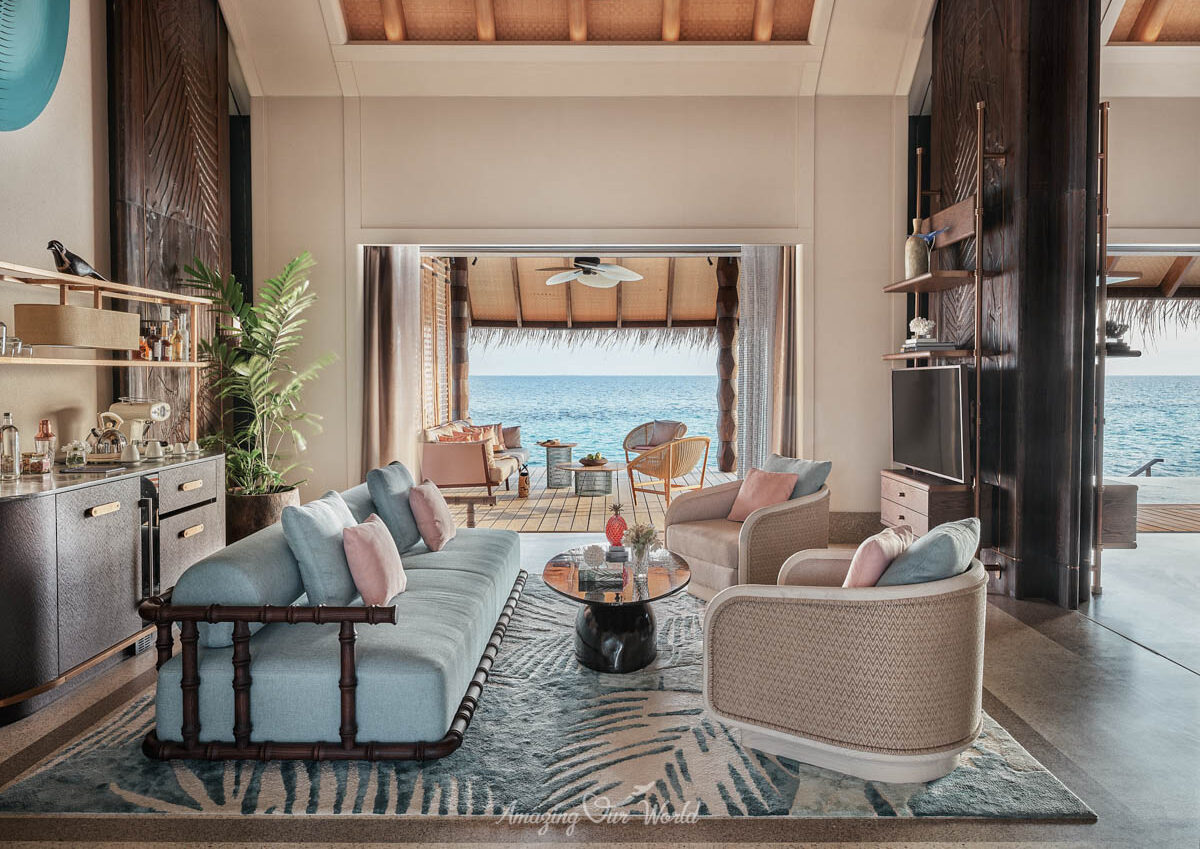 Mỗi biệt thự trên mặt nước đều được thiết kế tỉ mỉ, với trần nhà cao và cửa sổ lớn, tạo không gian thoáng đãng và ngập tràn ánh sáng tự nhiên. Nội thất kết hợp giữa phong cách hiện đại và nét truyền thống của Maldives, mang lại cảm giác ấm cúng và sang trọng.