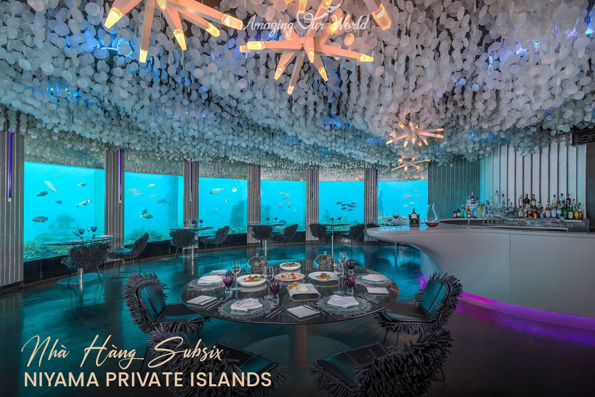 Subsix là nhà hàng đáy biển đầu tiên trên thế giới, nằm ở độ sâu 6 mét dưới mặt nước. Du khách sẽ được đưa đến đây bằng tàu cao tốc, sau đó bước xuống cầu thang ba tầng được chiếu sáng bởi những chiếc đèn chùm Ý mô phỏng san hô phát sáng. Không gian nhà hàng nổi bật với thiết kế lấy cảm hứng từ vỏ sò và các ghế ngồi hình hải quỳ.