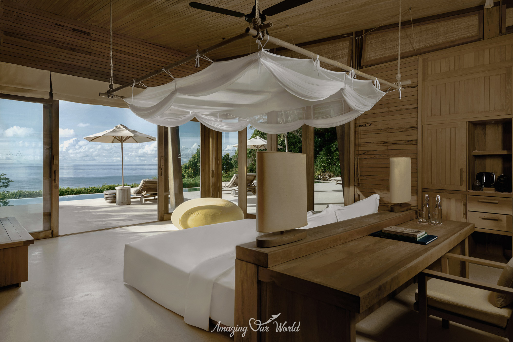 Lấy cảm hứng từ làng chài truyền thống, 50 biệt thự của Six Senses Con Dao được xây dựng chủ yếu từ tre, gỗ teak và kính, mở rộng tối đa tầm nhìn hướng biển. Mỗi villa đều có hồ bơi vô cực riêng, sân hiên tắm nắng, không gian sinh hoạt ngoài trời độc lập, đảm bảo sự riêng tư tuyệt đối. Từng chi tiết nội thất, từ trần tre, đèn lồng cho đến các vật dụng trang trí, đều gợi nhớ về nét đẹp mộc mạc, gần gũi của văn hóa Việt Nam.